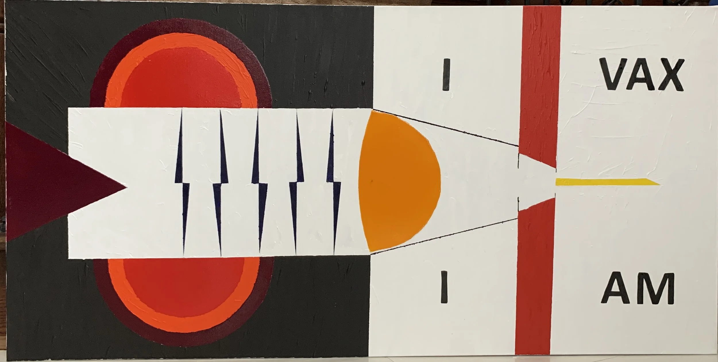 The names ascribed to these works, Syringe (2021) and Mask (2021) also align with the current sentiment. While the interpretation of the art on the canvas may be apparent, the imprinted phrase, though simple, is open to different interpretations. For students of philosophy, the works of René Descarte, Discourse on Method (1637) and the use of the phrase— “ I think, therefore I am”, (c ogito ergo sum in Latin, or Je pense, donc je suis in French), may come to mind in viewing this series. Such works come to mind as the global community navigates the maze of science, politics and ideologies in search of the truth.